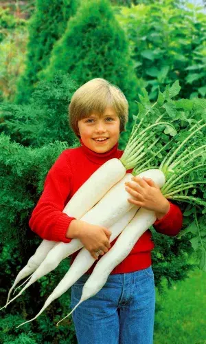 Популярный, сильнорослый гибрид, отличающийся суперурожайностью. Корнеплоды белые, выровненные, цилиндрические, длиной 50-90 см, массой 2-4 кг. Мякоть очень сочная, нежная, снежно-белая, плотной консистенции, отличного вкуса, без горечи.