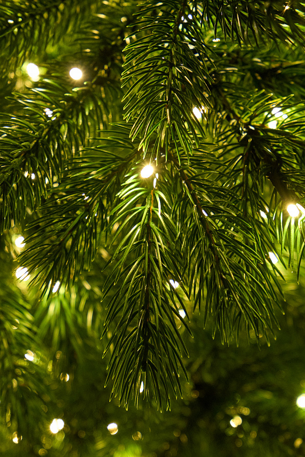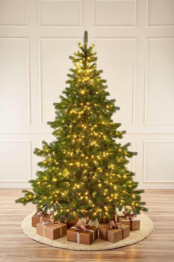 Полностью литые веточки повторяют форму натуральной хвои. Гирлянда аккуратно вплетена и практически не заметна. Пышные веточки разной длины густо покрывают всю крону и создают ее неповторимую форму.