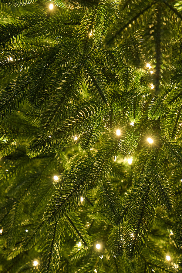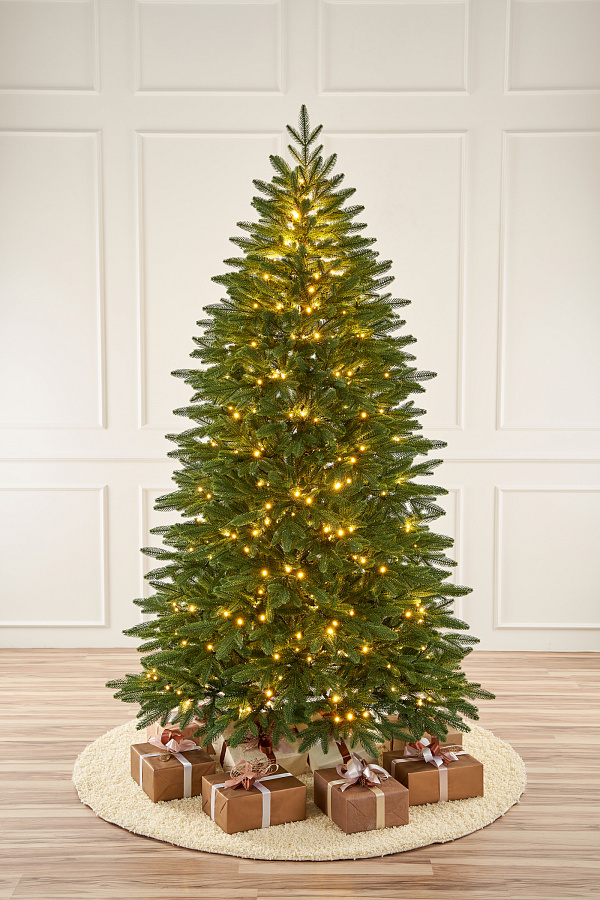 Эта елочка полностью выполнена из литых веточек. Она достаточно густая, с правильной формой и крупной веткой. Натуральный оттенок зеленого и теплый свет лампочек – неизменная классика в новогоднем декоре.