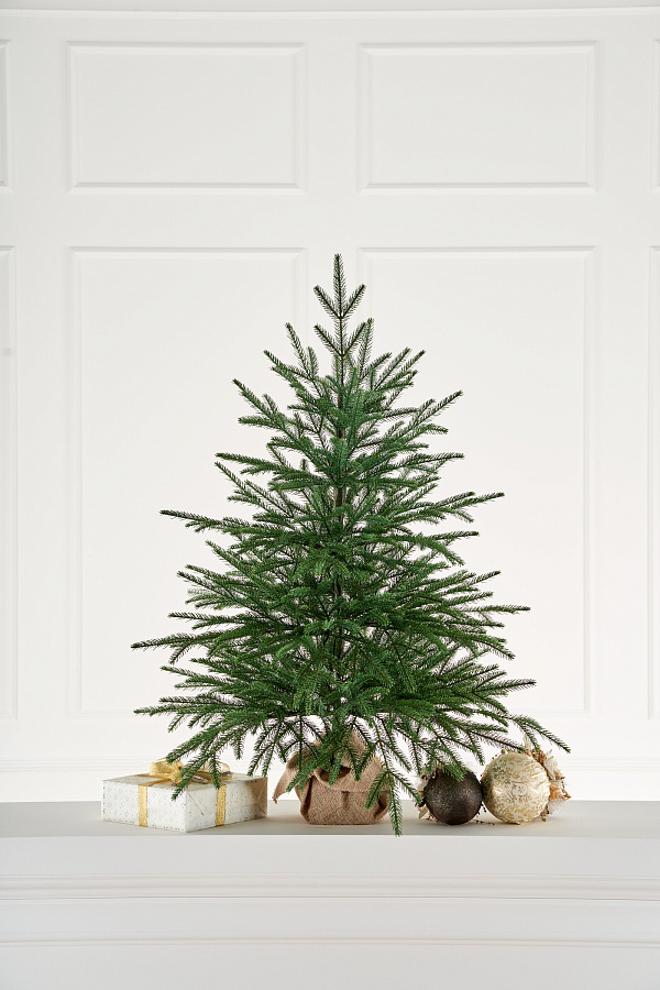Модель Семирамида имеет деревянную подставку в виде пенька, обёрнутого в мешковину. Ель выглядит самодостаточно и не нуждается в дополнительном декоре.